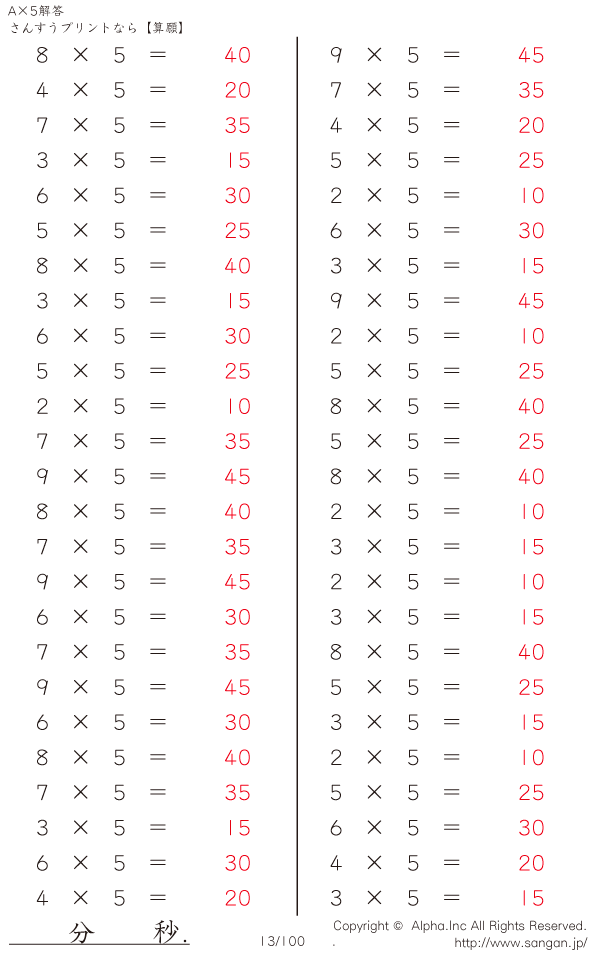 算数計算問題 A×5のPDFプリント [解答]013/100