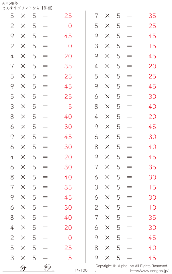 算数計算問題 A×5のPDFプリント [解答]014/100