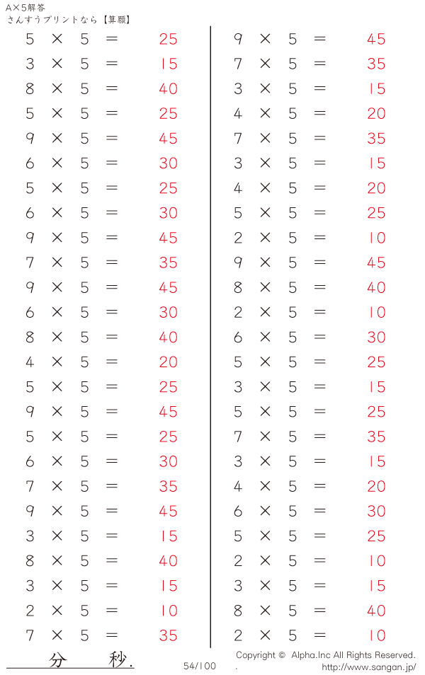 算数計算問題 A×5のPDFプリント [解答]054/100