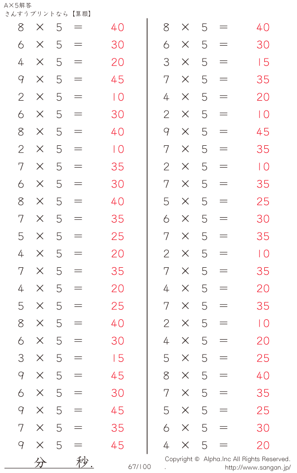 算数計算問題 A×5のPDFプリント [解答]067/100