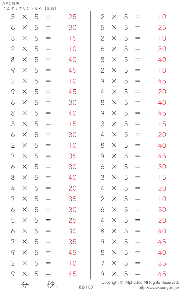算数計算問題 A×5のPDFプリント [解答]082/100