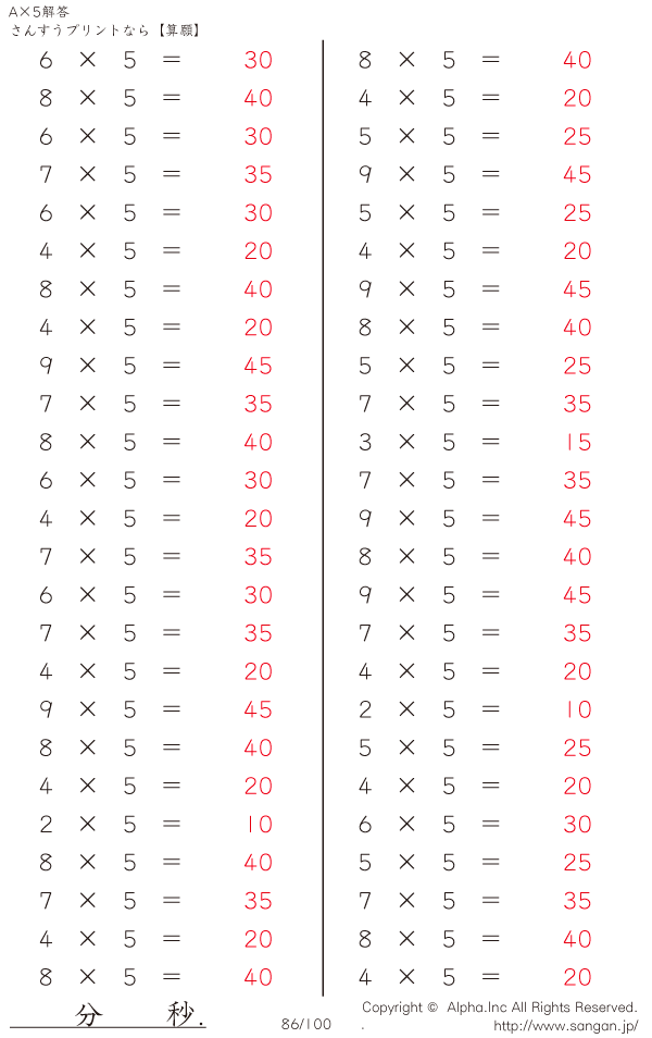 算数計算問題 A×5のPDFプリント [解答]086/100