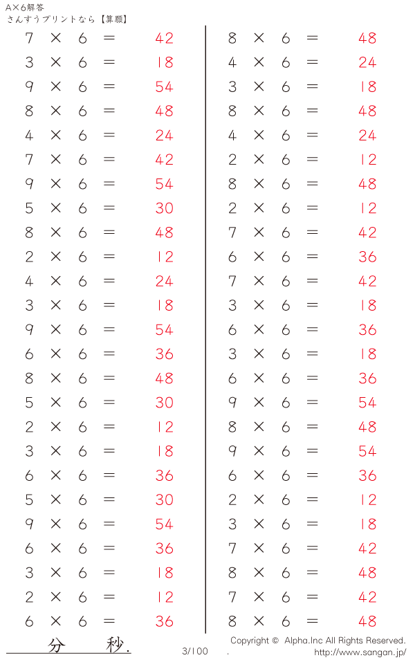 算数計算問題 A×6のPDFプリント [解答]003/100