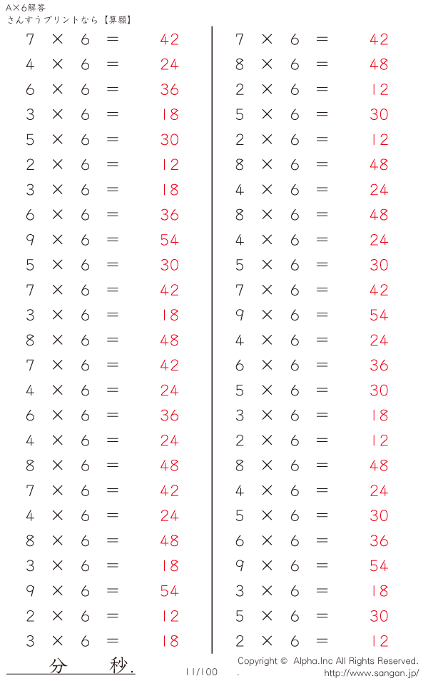 算数計算問題 A×6のPDFプリント [解答]011/100