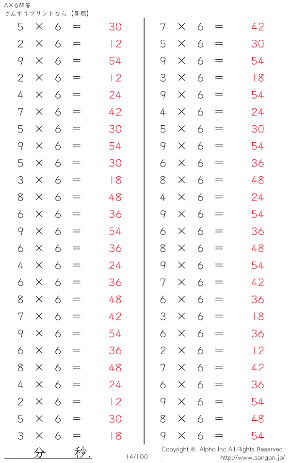 算数計算問題 A×6のPDFプリント [解答]014/100