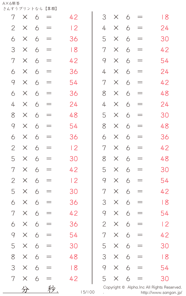 算数計算問題 A×6のPDFプリント [解答]015/100