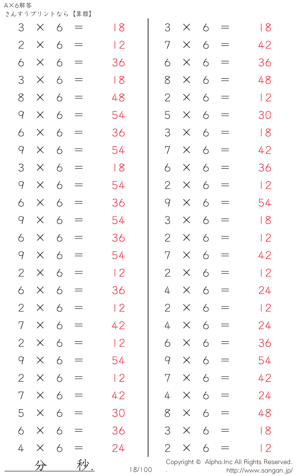 算数計算問題 A×6のPDFプリント [解答]018/100