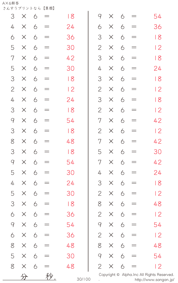 算数計算問題 A×6のPDFプリント [解答]030/100