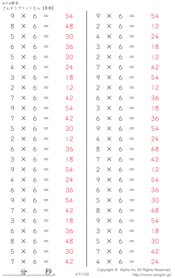 算数計算問題 A×6のPDFプリント [解答]047/100