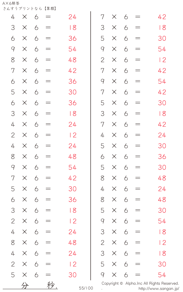 算数計算問題 A×6のPDFプリント [解答]055/100