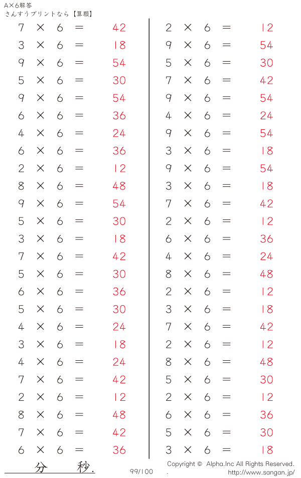算数計算問題 A×6のPDFプリント [解答]099/100