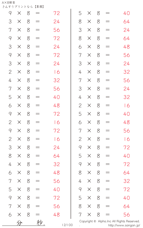 算数計算問題 A×8のPDFプリント [解答]012/100