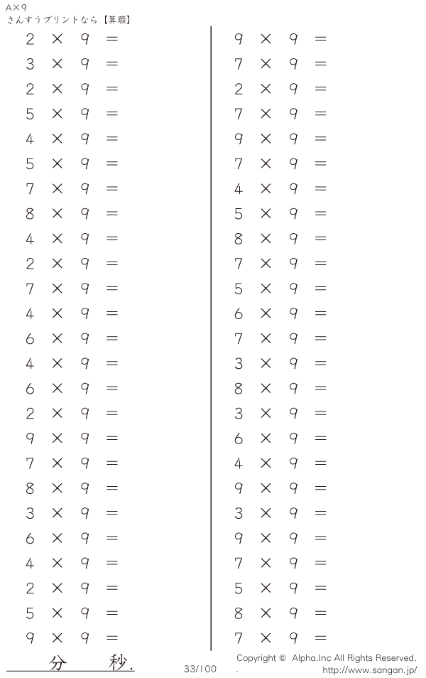 算数計算問題 A×9のPDFプリント [問題]033/100