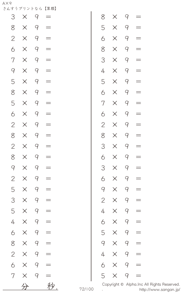算数計算問題 A×9のPDFプリント [問題]072/100