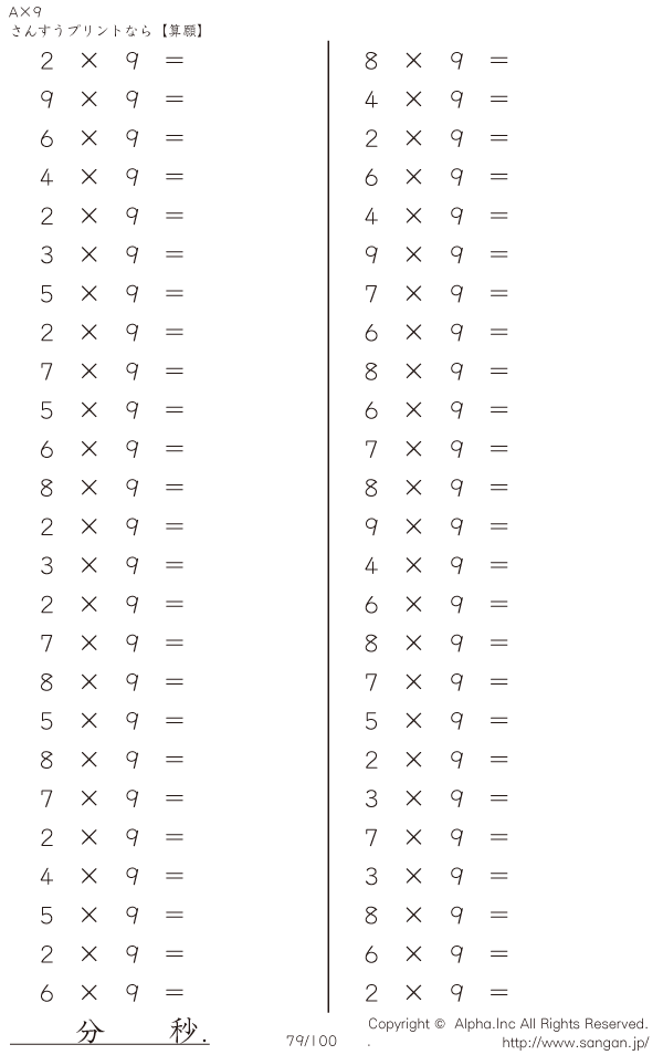 算数計算問題 A×9のPDFプリント [問題]079/100