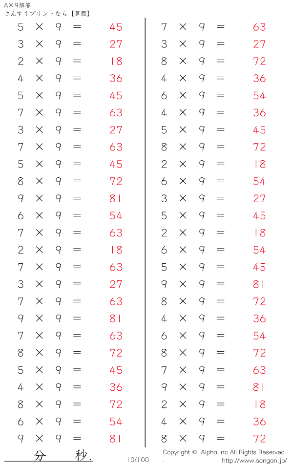 算数計算問題 A×9のPDFプリント [解答]010/100