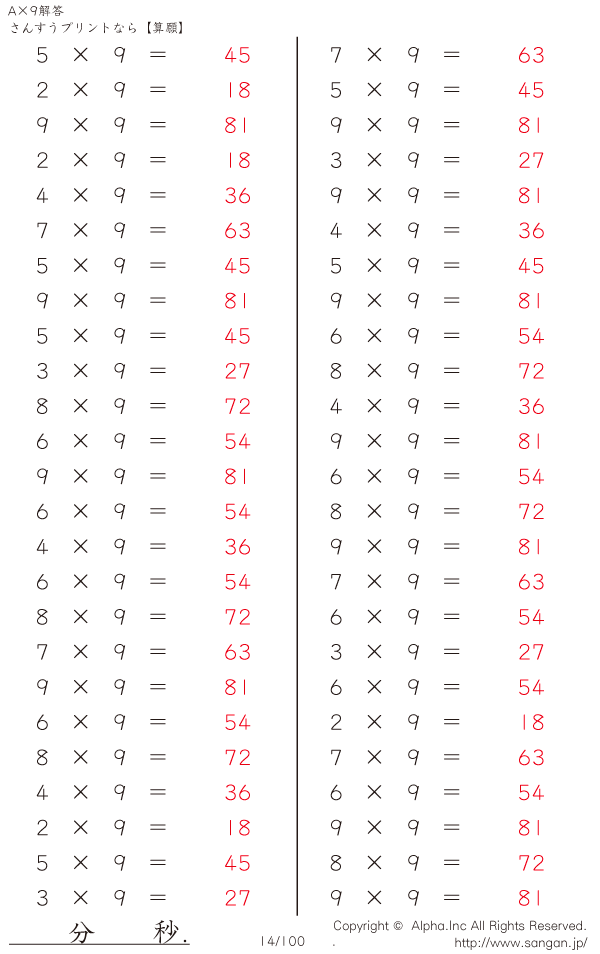 算数計算問題 A×9のPDFプリント [解答]014/100