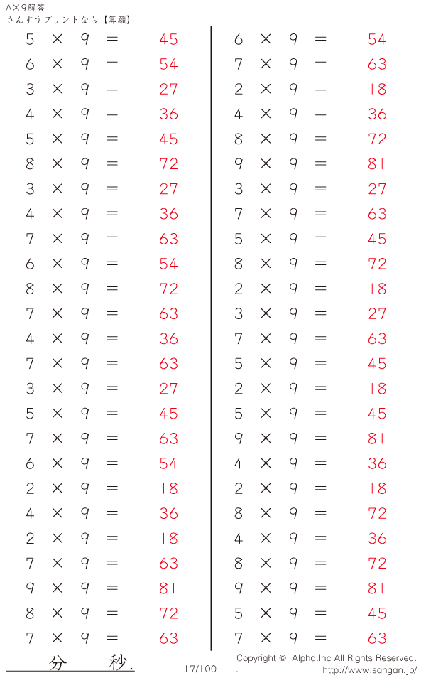 算数計算問題 A×9のPDFプリント [解答]017/100
