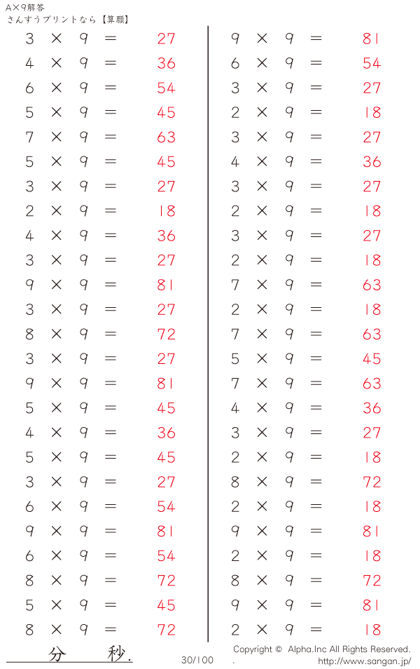 算数計算問題 A×9のPDFプリント [解答]030/100