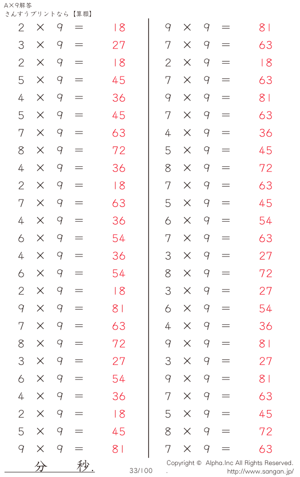 算数計算問題 A×9のPDFプリント [解答]033/100
