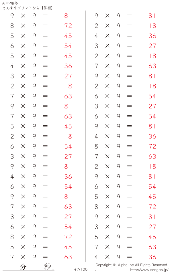 算数計算問題 A×9のPDFプリント [解答]047/100