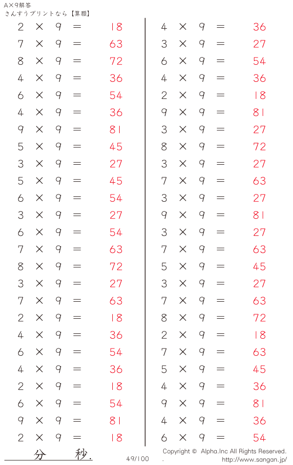 算数計算問題 A×9のPDFプリント [解答]049/100