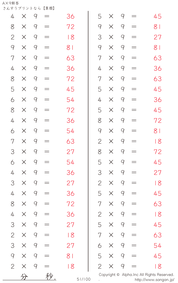 算数計算問題 A×9のPDFプリント [解答]051/100