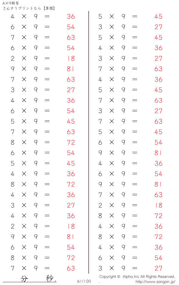 算数計算問題 A×9のPDFプリント [解答]061/100