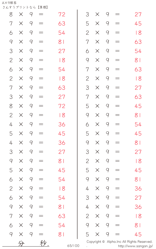 算数計算問題 A×9のPDFプリント [解答]065/100