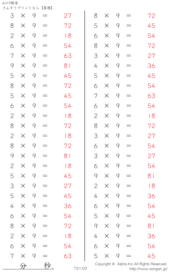 算数計算問題 A×9のPDFプリント [解答]072/100