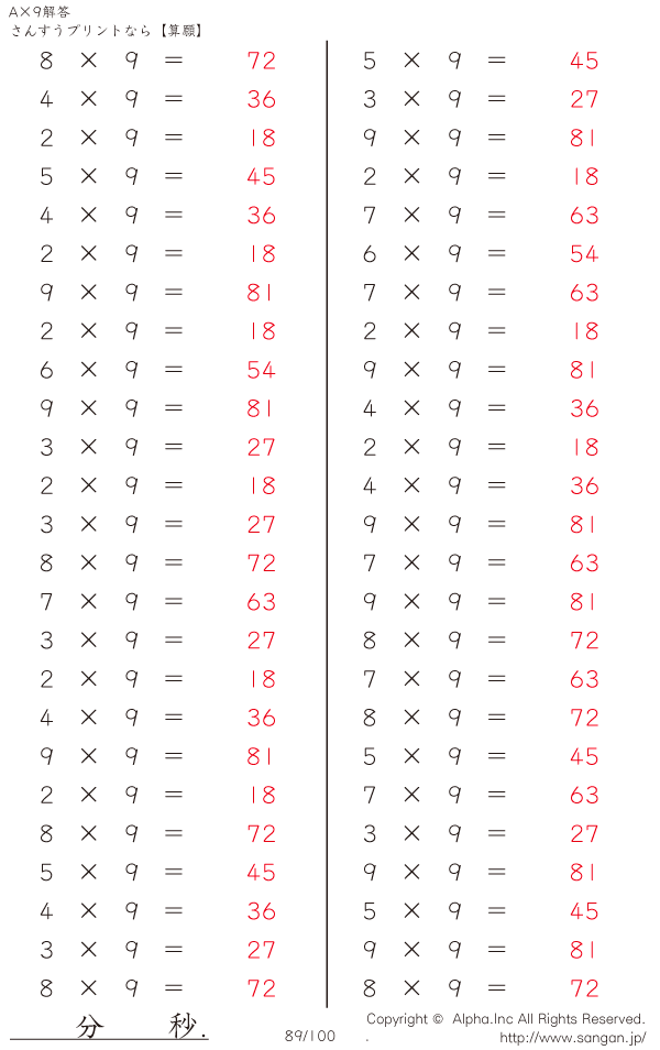 算数計算問題 A×9のPDFプリント [解答]089/100
