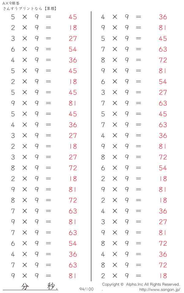 算数計算問題 A×9のPDFプリント [解答]094/100
