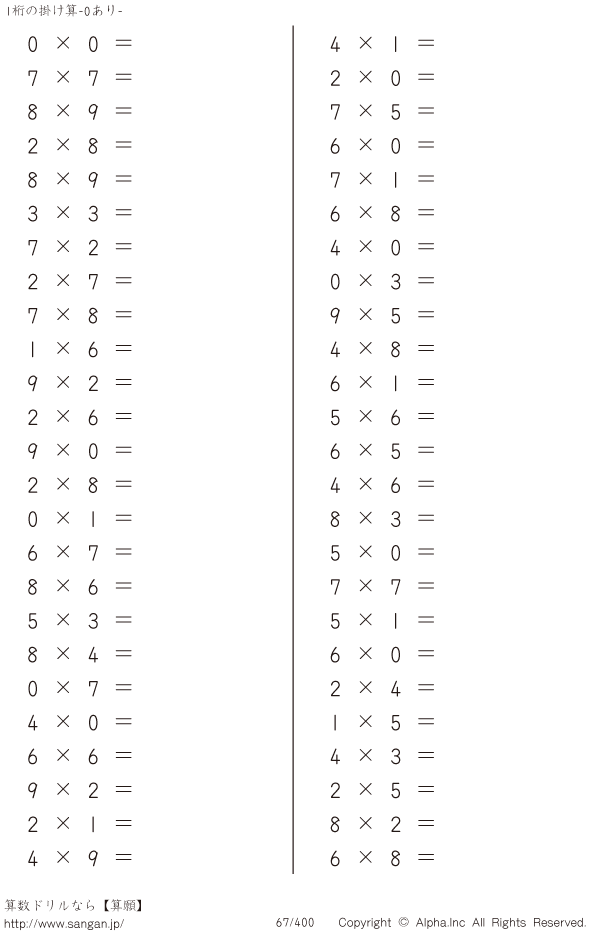 上記のボタンから「1桁の掛け算(0あり)」の算数数学ドリル・計算ドリル(PDFプリント)がダウンロードできます。個人利用は無料です(家庭以外での配布は有料です)。