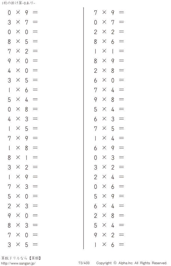 上記のボタンから「1桁の掛け算(0あり)」の算数数学ドリル・計算ドリル(PDFプリント)がダウンロードできます。個人利用は無料です(家庭以外での配布は有料です)。