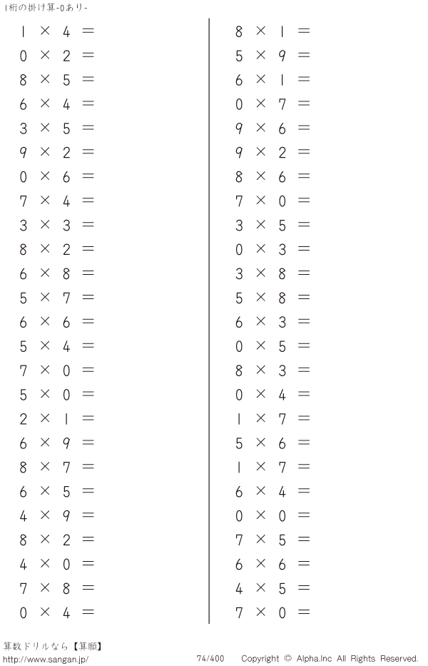 上記のボタンから「1桁の掛け算(0あり)」の算数数学ドリル・計算ドリル(PDFプリント)がダウンロードできます。個人利用は無料です(家庭以外での配布は有料です)。