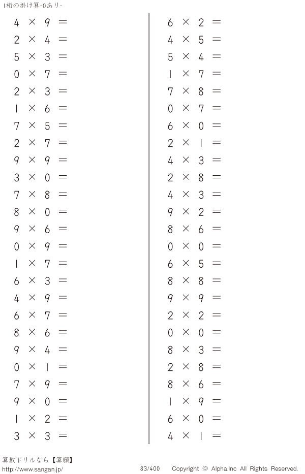 上記のボタンから「1桁の掛け算(0あり)」の算数数学ドリル・計算ドリル(PDFプリント)がダウンロードできます。個人利用は無料です(家庭以外での配布は有料です)。