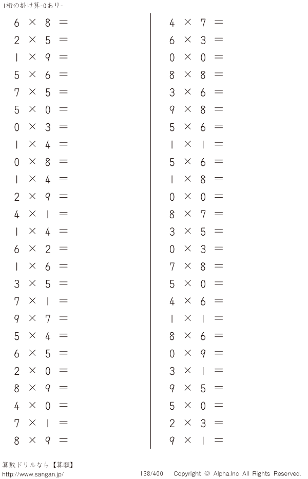 上記のボタンから「1桁の掛け算(0あり)」の算数数学ドリル・計算ドリル(PDFプリント)がダウンロードできます。個人利用は無料です(家庭以外での配布は有料です)。