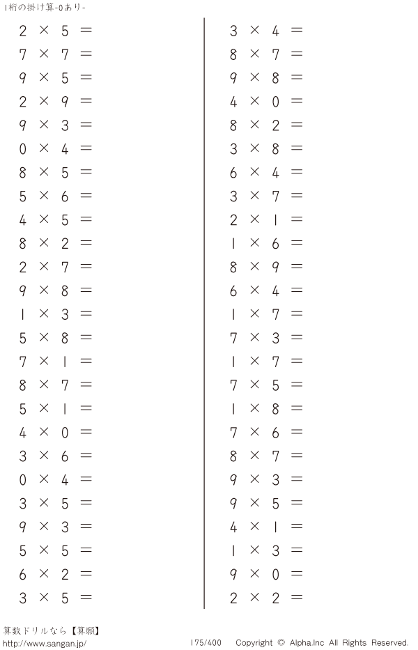 上記のボタンから「1桁の掛け算(0あり)」の算数数学ドリル・計算ドリル(PDFプリント)がダウンロードできます。個人利用は無料です(家庭以外での配布は有料です)。