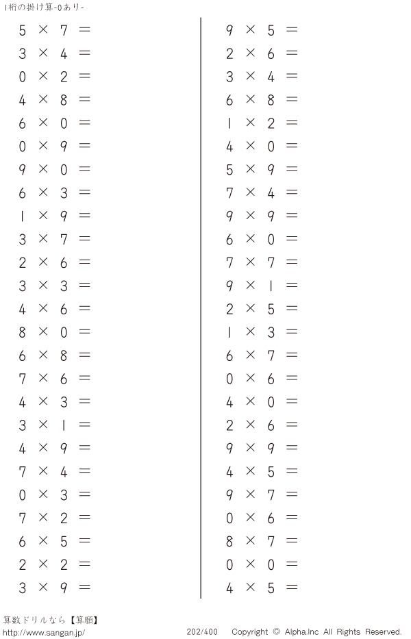 上記のボタンから「1桁の掛け算(0あり)」の算数数学ドリル・計算ドリル(PDFプリント)がダウンロードできます。個人利用は無料です(家庭以外での配布は有料です)。