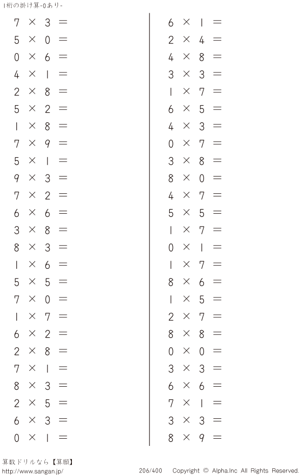 上記のボタンから「1桁の掛け算(0あり)」の算数数学ドリル・計算ドリル(PDFプリント)がダウンロードできます。個人利用は無料です(家庭以外での配布は有料です)。