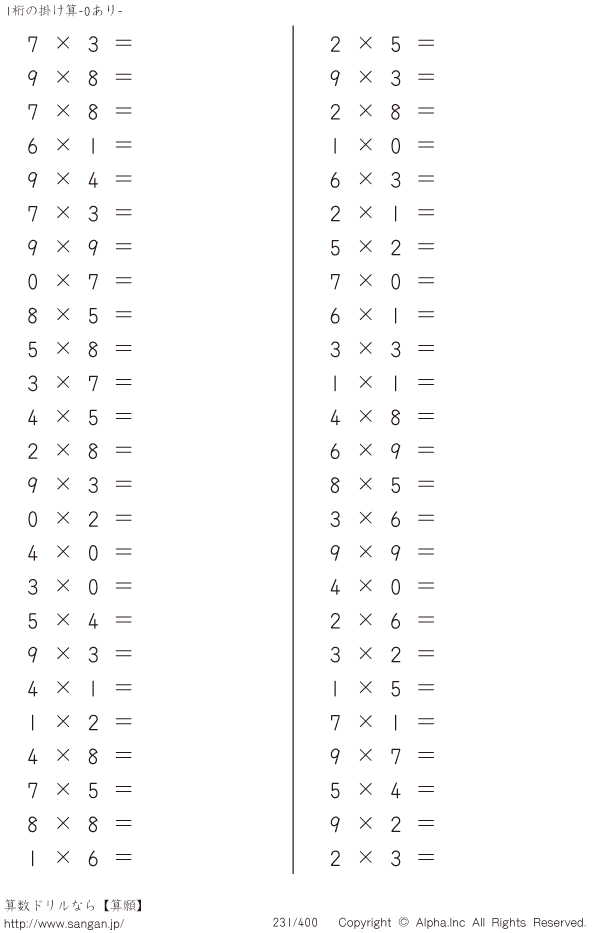1桁の掛け算(0あり) [問題]231/400