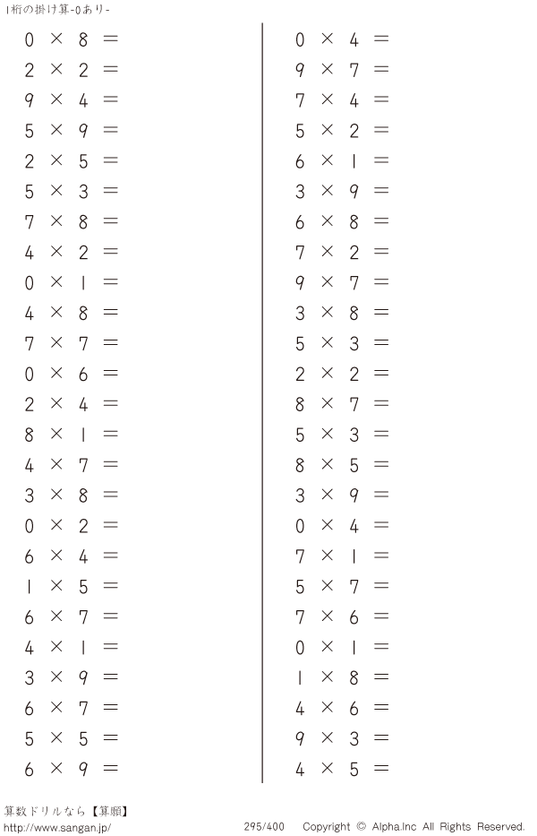 上記のボタンから「1桁の掛け算(0あり)」の算数数学ドリル・計算ドリル(PDFプリント)がダウンロードできます。個人利用は無料です(家庭以外での配布は有料です)。