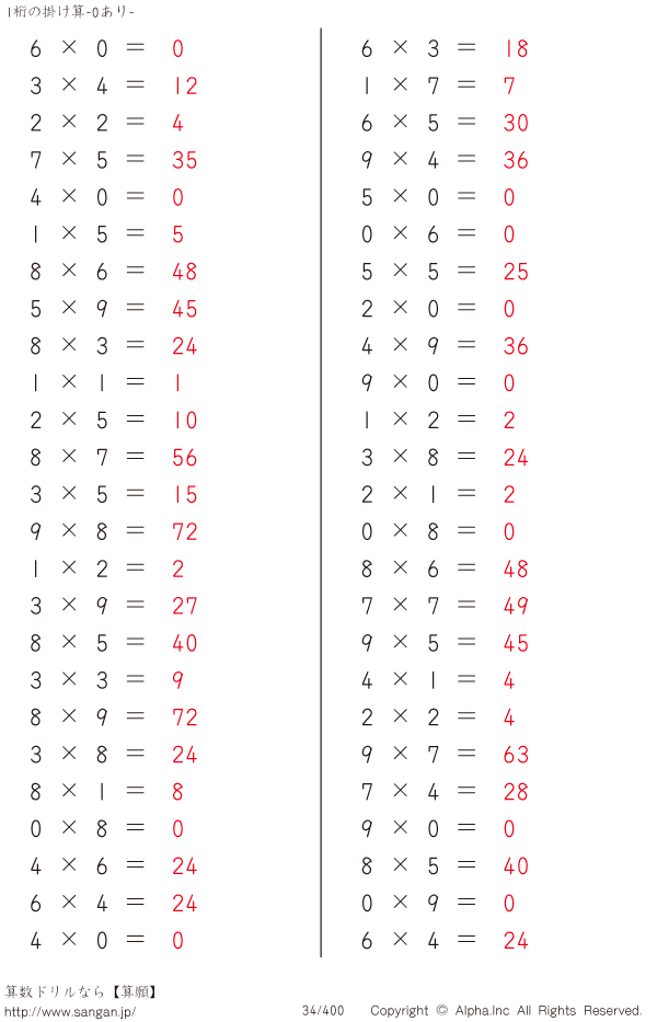 上記のボタンから「1桁の掛け算(0あり)」の算数数学ドリル・計算ドリル(PDFプリント)がダウンロードできます。個人利用は無料です(家庭以外での配布は有料です)。