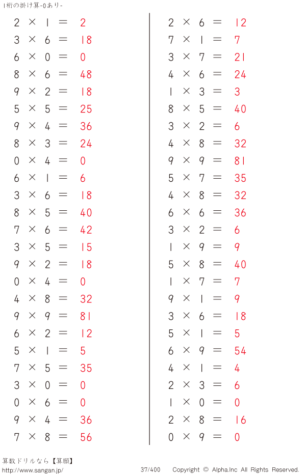 上記のボタンから「1桁の掛け算(0あり)」の算数数学ドリル・計算ドリル(PDFプリント)がダウンロードできます。個人利用は無料です(家庭以外での配布は有料です)。