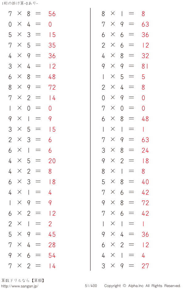 1桁の掛け算(0あり) [解答]051/400