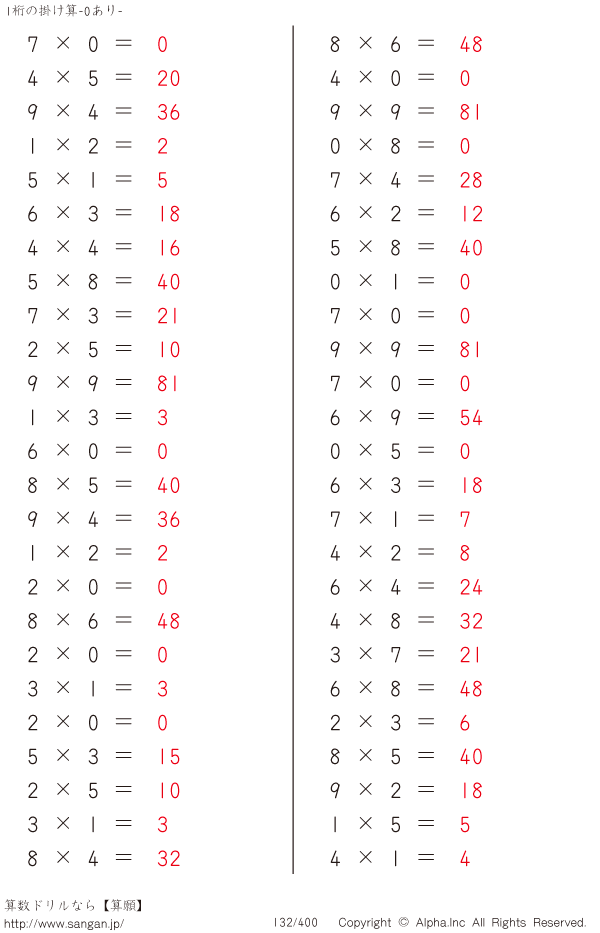 上記のボタンから「1桁の掛け算(0あり)」の算数数学ドリル・計算ドリル(PDFプリント)がダウンロードできます。個人利用は無料です(家庭以外での配布は有料です)。