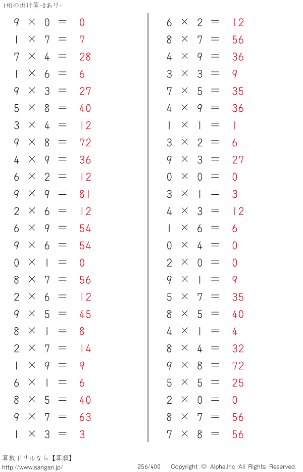 1桁の掛け算(0あり) [解答]256/400