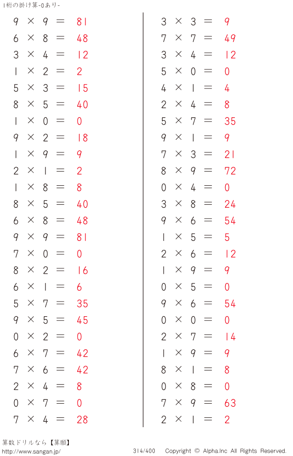 1桁の掛け算(0あり) [解答]314/400