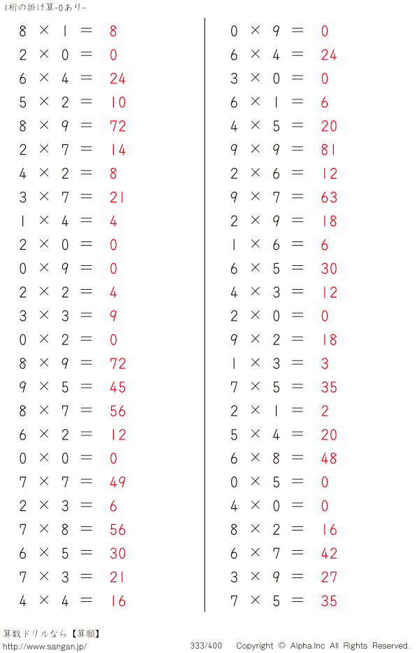 上記のボタンから「1桁の掛け算(0あり)」の算数数学ドリル・計算ドリル(PDFプリント)がダウンロードできます。個人利用は無料です(家庭以外での配布は有料です)。