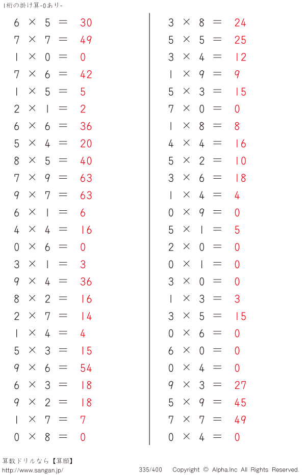 上記のボタンから「1桁の掛け算(0あり)」の算数数学ドリル・計算ドリル(PDFプリント)がダウンロードできます。個人利用は無料です(家庭以外での配布は有料です)。